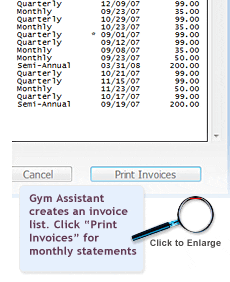 Use Gym Assistant’s Report Filter to select invoices by date range, type of plan or due date. Invoices can be printed or emailed! If you use ProShop, our POS software, all charges to member accounts can be included in billing statements.